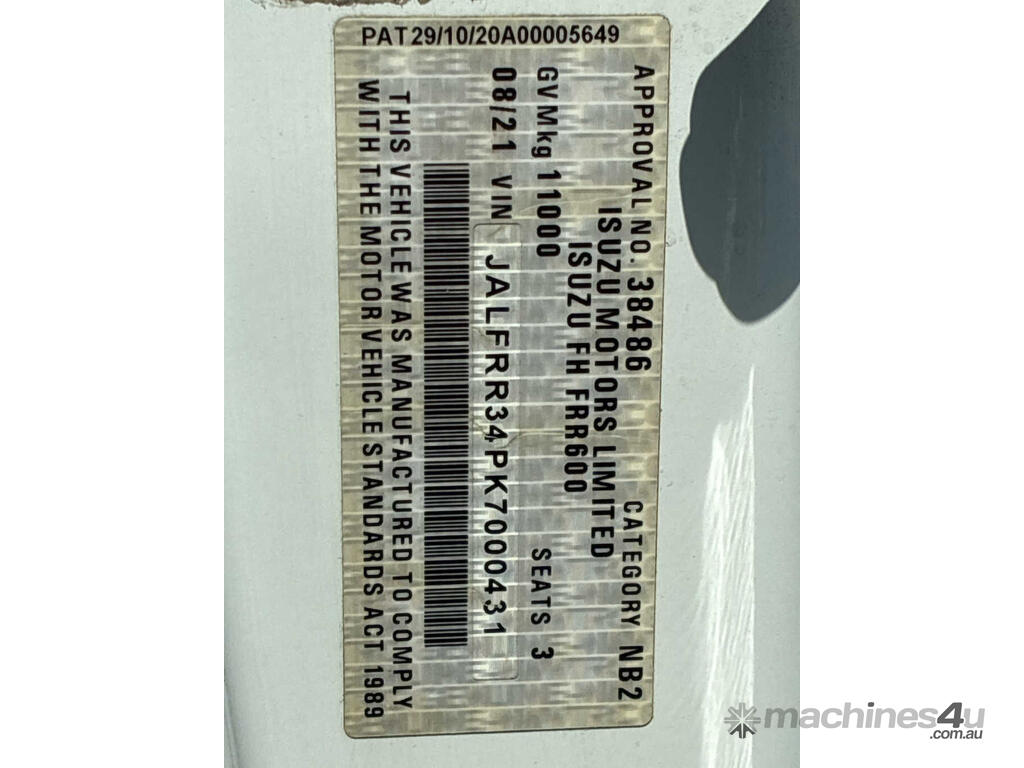 CP: 08/2021,Isuzu,FRR 110-260,Curtain Sider,Automatic,Spring,Engine #: 6HK1248217,6 Cyl,Diesel Turbo,367650 (Kms. Showing on Odometer),6061 (Hrs. Showing on Hour meter),Colour: White,Rego. No: NP(XO35EL), Unregistered NSW,VIN: JALFRR34PK7000431,Key No: 510S,Length: 9.2 m,GVM: 11000,GCM: 20000,Sold with No Plates,Key No: 510S