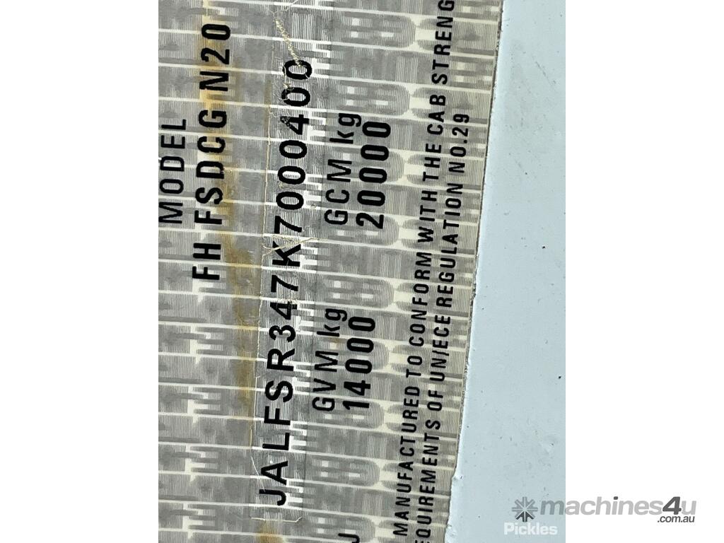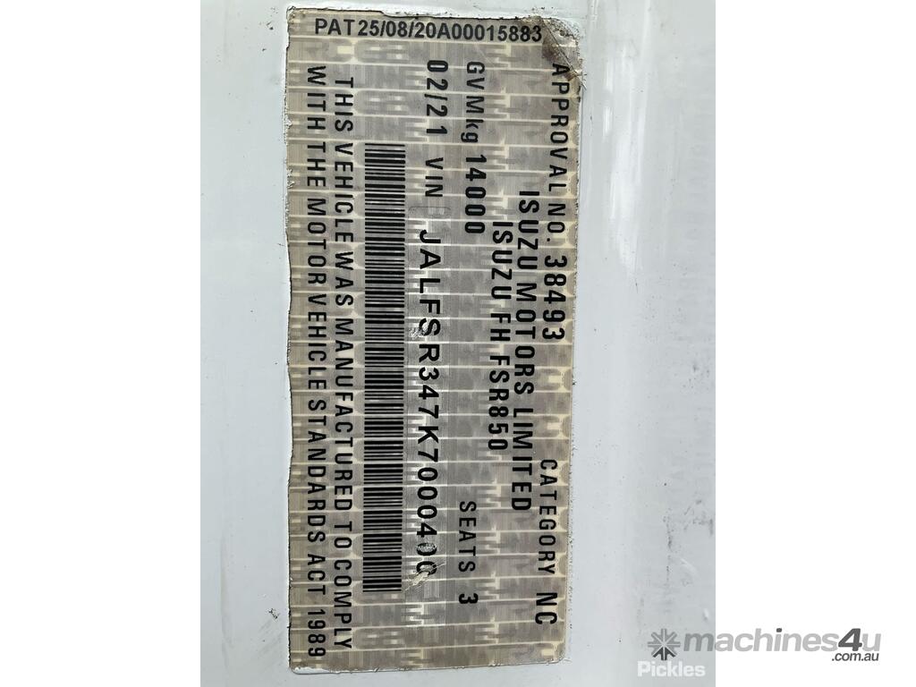 CP: 02/2021,Isuzu,FSR850,Pantech,Automatic,Airbags ,Engine #: 6HK1241105,6 Cyl,Diesel Turbo,160373 (Kms. Showing on Odometer),4298 (Hrs. Showing on Hour meter),Colour: White,Unregistered,VIN: JALFSR347K7000400,Key No: 311E,Length: 10.7 m,GVM: 14000,GCM: 20000,Sold with No Plates,Key No: 311E