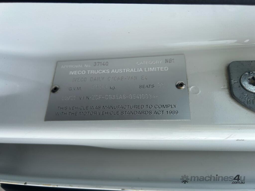 CP: 09/2021,Iveco,Daily,Van,Automatic,Spring,Diesel,83464 (Kms. Showing on Odometer),Hourmeter not visible,Colour: White,Unregistered,VIN: ZCFCG35A,Key No: 444,GVM: 3800,Sold with No Plates,Key No: 444