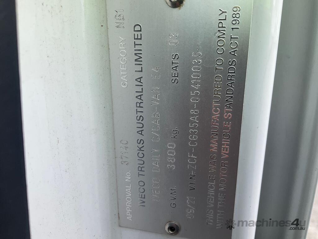 CP: 09/2021,Iveco,Daily,35S14V,Van,Automatic,Leaf Spring Suspension,2.3 Ltr,4 Cyl,Diesel,8 Gears,53675 (Kms. Showing on Odometer),Hourmeter not visible,Colour: White,Rego. No: NP(1TP6ME), Unregistered VIC,VIN: ZCFCG35A,Key No: 44,GVM: 3800,Sold with No Plates,Key No: 44