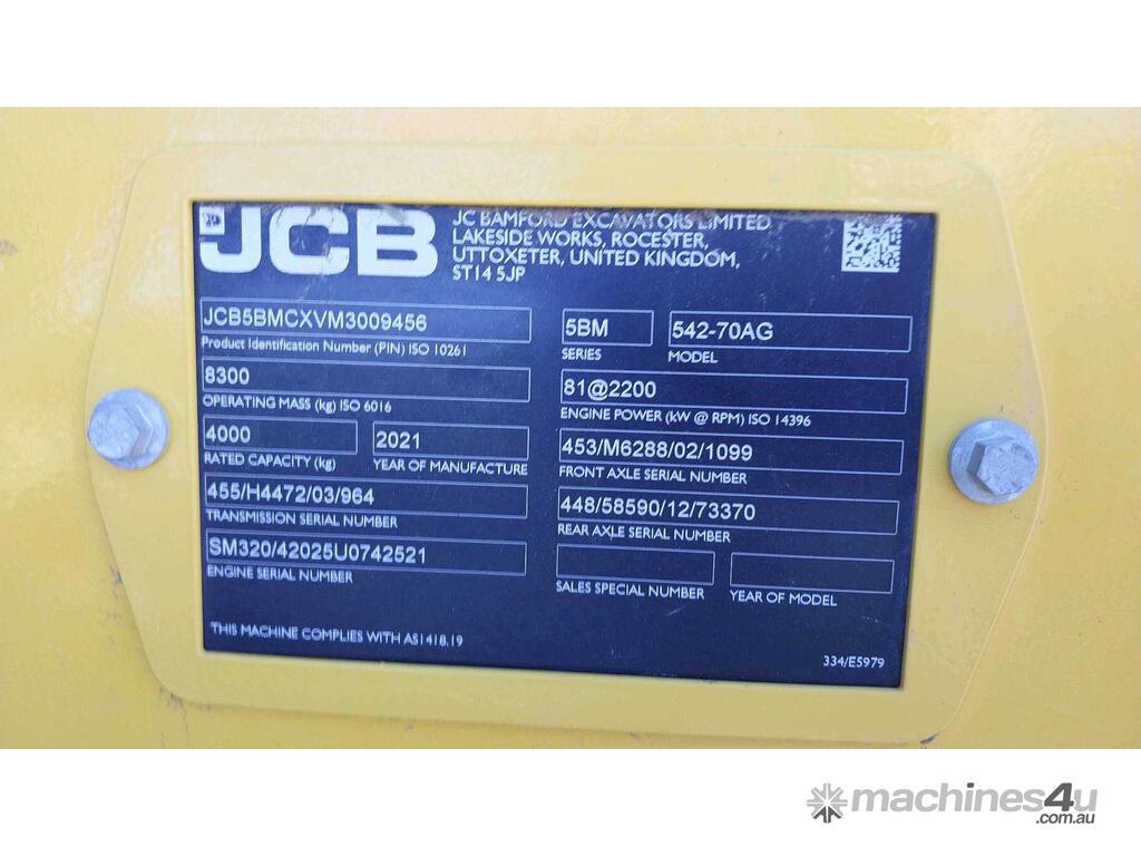 CP: CIRCA 2021,JCB,542-70AGS,Telehandler,4 Cyl,Diesel,Odometer not visible,Hourmeter not visible,Colour: Yellow,Rego. No: NP(XV43WU), Unregistered,VIN: JCB5BMCXVM3009456,Sold with No Plates,WOVR Status: WOVR N/A,Incident Type: Impact