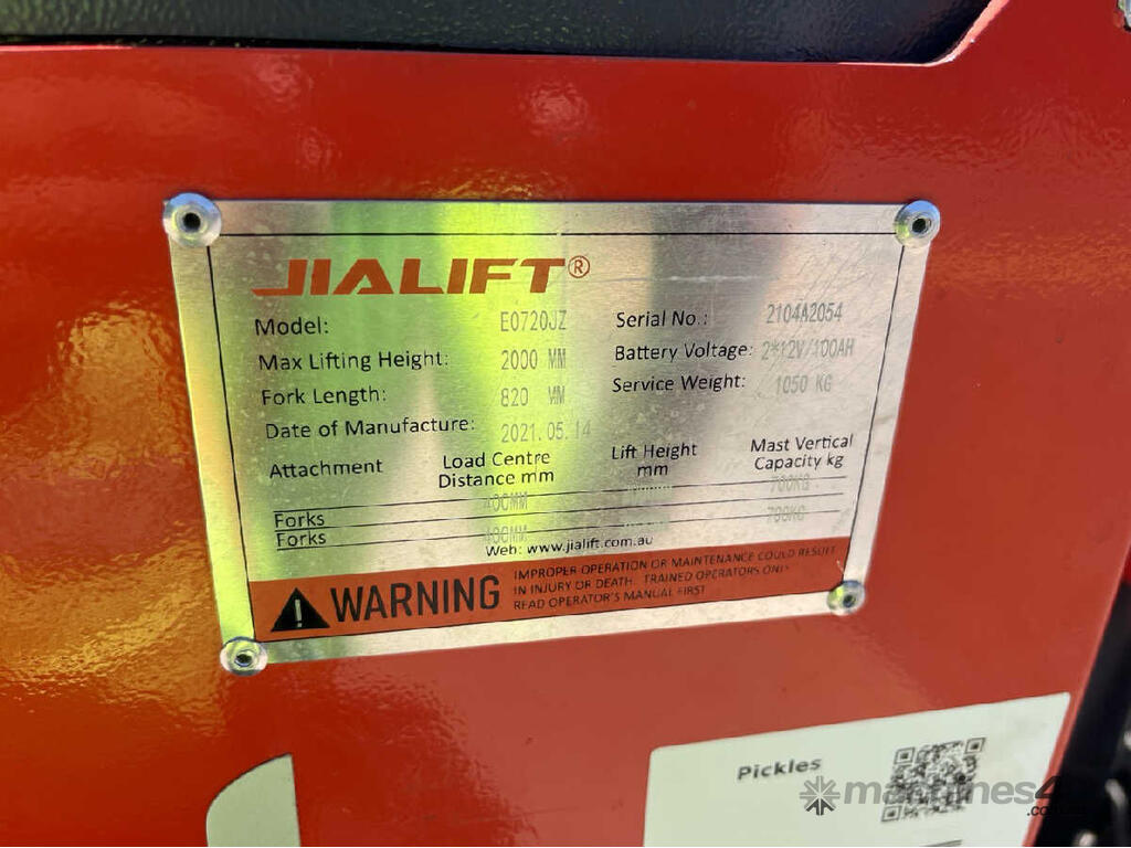 CP: 05/2021,Built: 05/2021,Jialift,E0720JZ,Walk Behind Electric Forklift,Electric,Odometer not visible,17 (Hrs. Showing on Hour meter),Colour: Red,Unregistered,Serial No: 2104A2054,Sold with No Plates,Key No: P85
