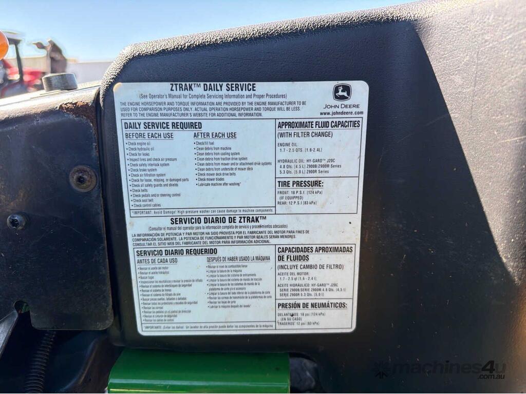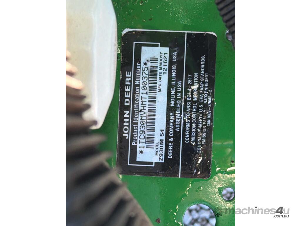 CP: CIRCA 2021,Built: 12/2021,John Deere,Z930M,Zero Turn Ride On Mower,Engine #: FX801VC42049,2 Cyl,Petrol - Unleaded ULP,Odometer not visible,1186 (Hrs. Showing on Hour meter),Colour: Green,Unregistered,VIN: 1TC930MVHMT100375,ROPS No: null,Sold with No Plates,Key No: NO KEY