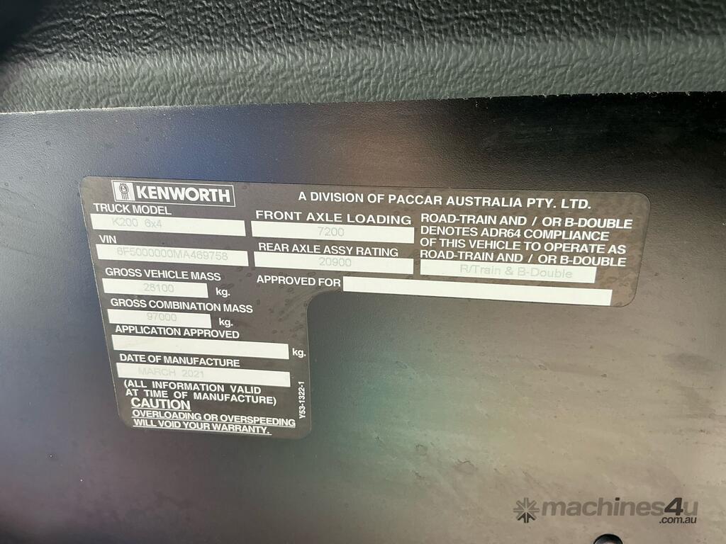 CP: 03/2021,Kenworth,K200 Big Cab,Prime Mover,Automatic,Air Bag Suspension ,Cummins X15,6 Cyl,Diesel,Odometer not visible,Hourmeter not visible,Colour: White,Rego. No: NP(XV52XL), Unregistered VIC,VIN: 6F5000000MA469758,Key No: 43,GVM: 28100,GCM: 97000,Sold with No Plates,Key No: 43
