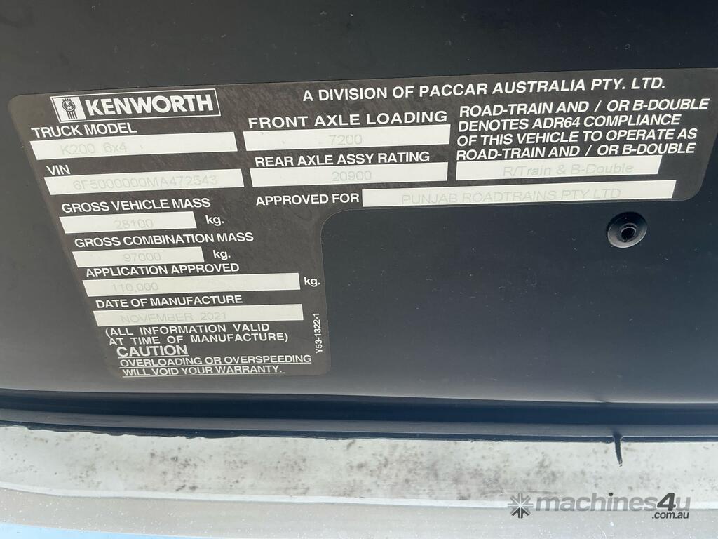 CP: 11/2021,Kenworth,K200 Series,Prime Mover,Automatic,Air Bag Suspension,Engine #: 80357442,Cummins X15,6 Cyl,Diesel,762185 (Kms. Showing on Odometer),9999 (Hrs. Showing on Hour meter),Colour: White,Rego. No: NP(XV53YT), Unregistered,VIN: 6F5000000MA472543,Key No: 21,GVM: 28100,GCM: 97000,Sold with No Plates,Key No: 21