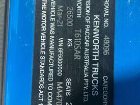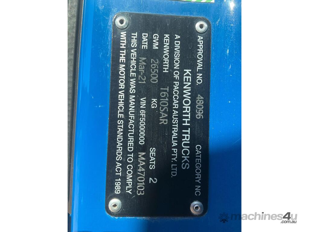 CP: 03/2021,Kenworth,T610SAR,Prime Mover,Manual,Airbag,Engine #: 80297520,Cummins X15,6 Cyl,Diesel,18 Gears,949856 (Kms. Showing on Odometer),12619 (Hrs. Showing on Hour meter),Colour: Blue,Rego. No: NP(XV47RM), Unregistered NAT,VIN: 6F5000000MA470103,GVM: 26500,GCM: 97000,Sold with No Plates