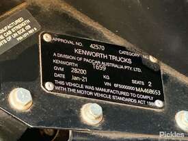 CP: 01/2021,Kenworth,T659,6x4 Sleeper Cab Prime Mover,Manual,airbags,6 Cyl,Diesel,Odometer not visible,Hourmeter not visible,Colour: Green,Rego. No: NP(XQ61QI), Unregistered,VIN: 6F5000000MA468653,GVM: 28200,Sold with No Plates,WOVR Status: WOVR N/A,Incident Type: Impact