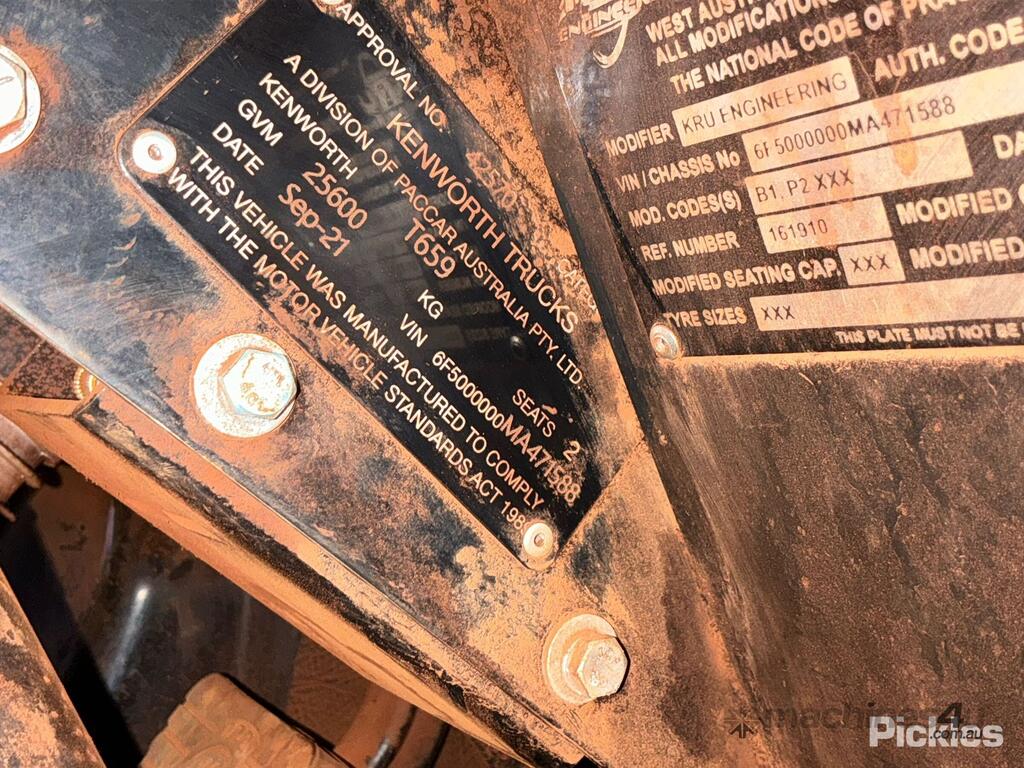 CP: 09/2021,Kenworth,T659,Prime Mover,Manual,LeafSpring,6 Cyl,Diesel Turbo,Odometer not visible,Hourmeter not visible,Colour: White,Unregistered WA,VIN: 6F5000000MA471588,GVM: 25600,Sold with No Plates,WOVR Status: Repairable Write-Off,Incident Type: Impact