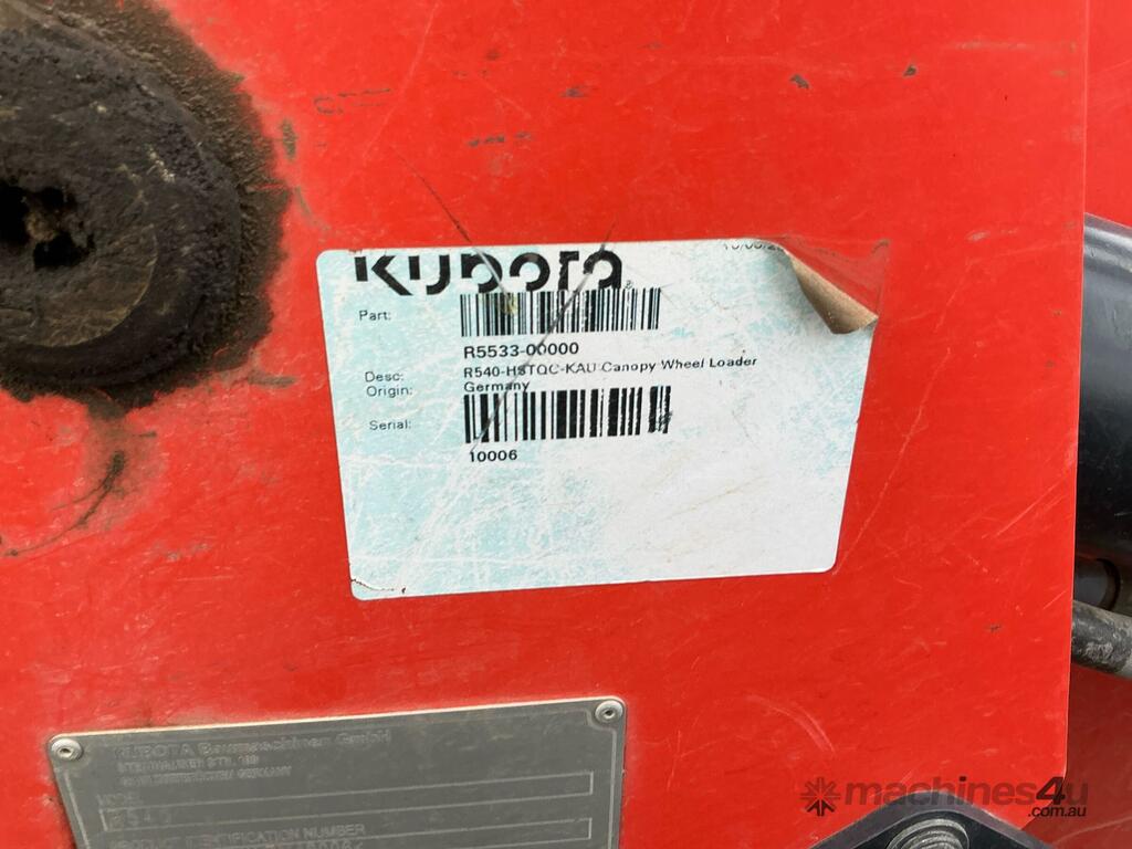 CP: 06/2021,Built: 06/2021,Kubota,R540,Wheeled Loader,4 Cyl,Diesel,Odometer not visible,1216 (Hrs. Showing on Hour meter),Colour: Orange,Unregistered,VIN: KBC5Z53CHLZM10006,Sold with No Plates,WOVR Status: WOVR N/A,Incident Type: Impact