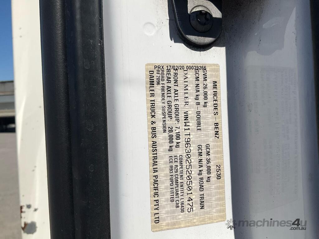 CP: 06/2021,Mercedes Benz,Actros 2630,Curtainsider,Automatic,Airbag,Engine #: 936912C02275S26,6 Cyl,Diesel Turbo,409499 (Kms. Showing on Odometer),Hourmeter not visible,Colour: White,Rego. No: XO17AN NSW,Rego expiry: 17/05/2026,VIN: W1T1475,Key No: 412S,Length: 11.3 m,GVM: 26000,GCM: 36000,Sold with No Plates,Key No: 412S