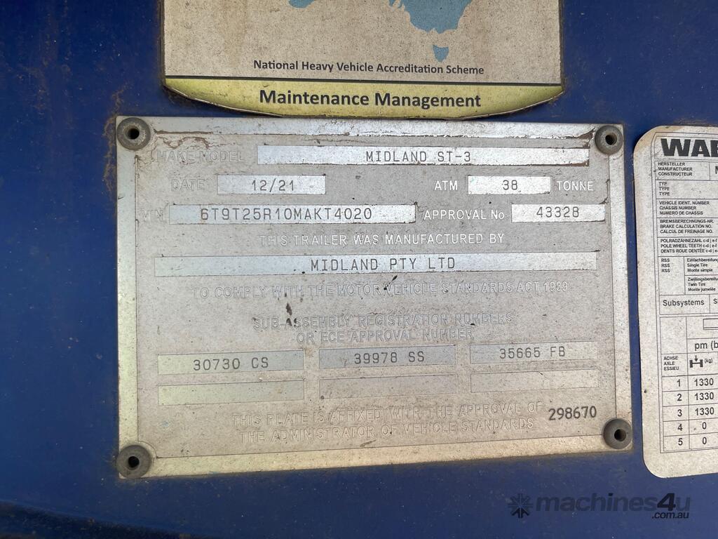 CP: 12/2021,Midland,ST-3,Tri Axle Skel Trailer,352004 (Kms. Showing on Hubometer),Colour: Blue,Rego. No: NP(YN75UK), Unregistered NAT,VIN: 6T9T25R10MAKT4020,Sold with No Plates