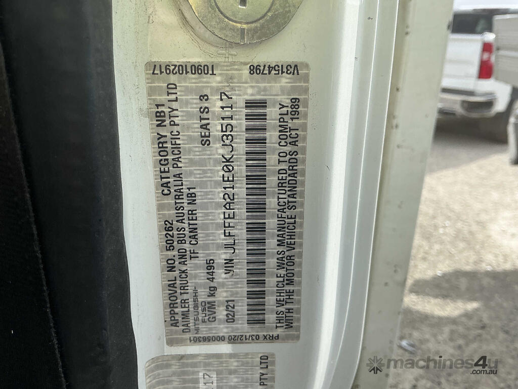 CP: 02/2021,Mitsubishi Fuso,Canter 515,Rigid Tray,Automatic,Diesel,Odometer not visible,Hourmeter not visible,Colour: White,Rego. No: 1SZ7KL VIC,VIN: JLFFEA21E0KJ35117,Length: 14 ft,GVM: 4495,GCM: 7995,Sold with No Plates,WOVR Status: Repairable Write-Off,Incident Type: Impact