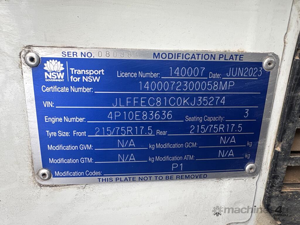 CP: 05/2021,Mitsubishi,Fuso Canter 815,Tipper,Automatic,Leaf Spring Suspension,Mitsubishi 4P10-7AT4,Diesel,Turbo,60514 (Kms. Showing on Odometer),Hourmeter not visible,Colour: White,Rego. No: NP(XO02BL), Unregistered NSW,VIN: JLFFEC81C0KJ35274,Key No: 51,Length: 18 Ft,GVM: 7500,GCM: 11000,Sold with No Plates,Key No: 51