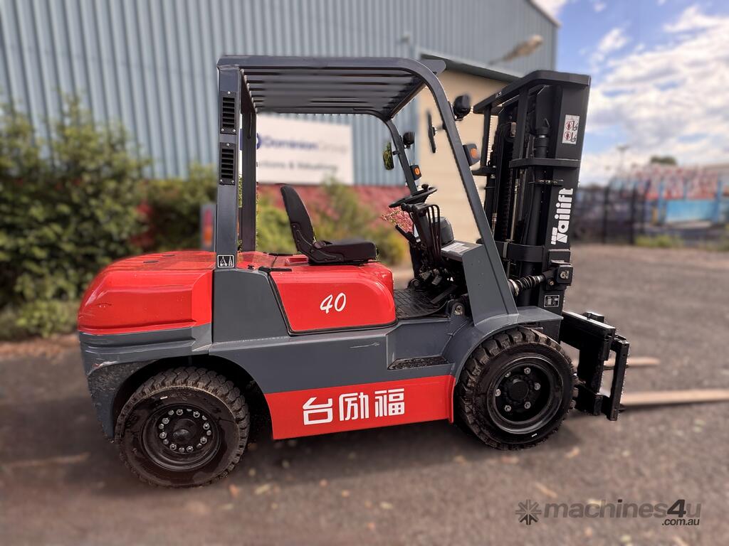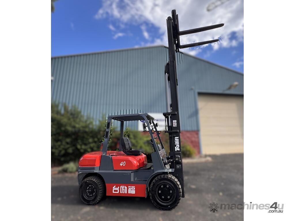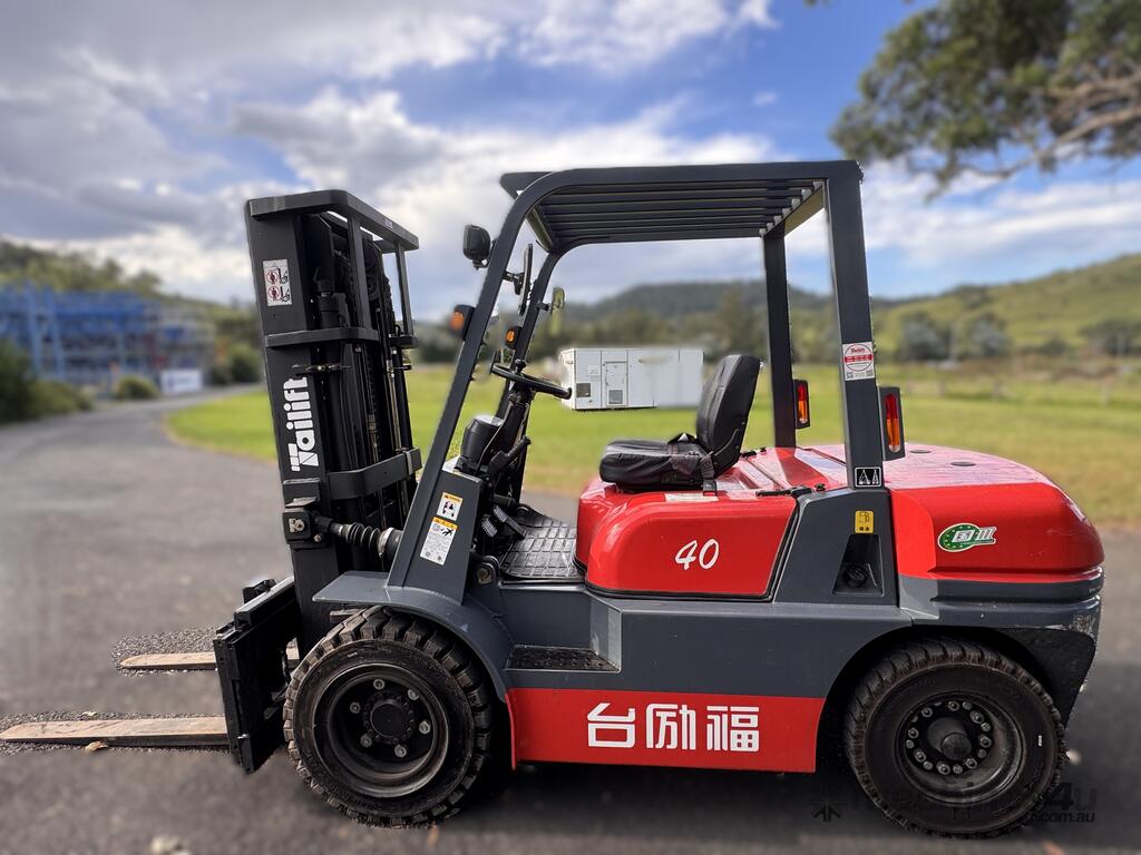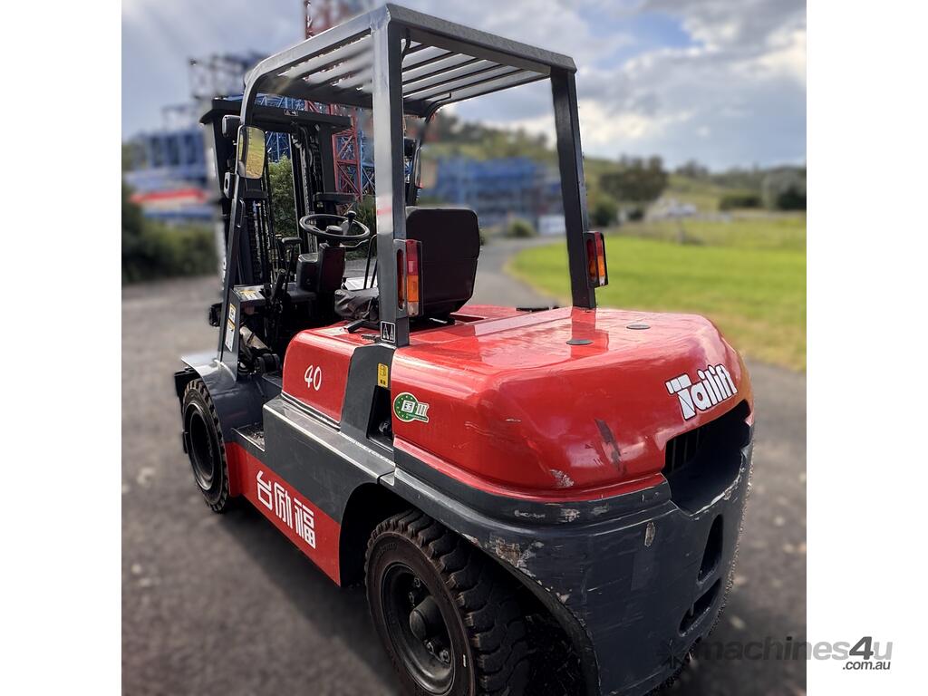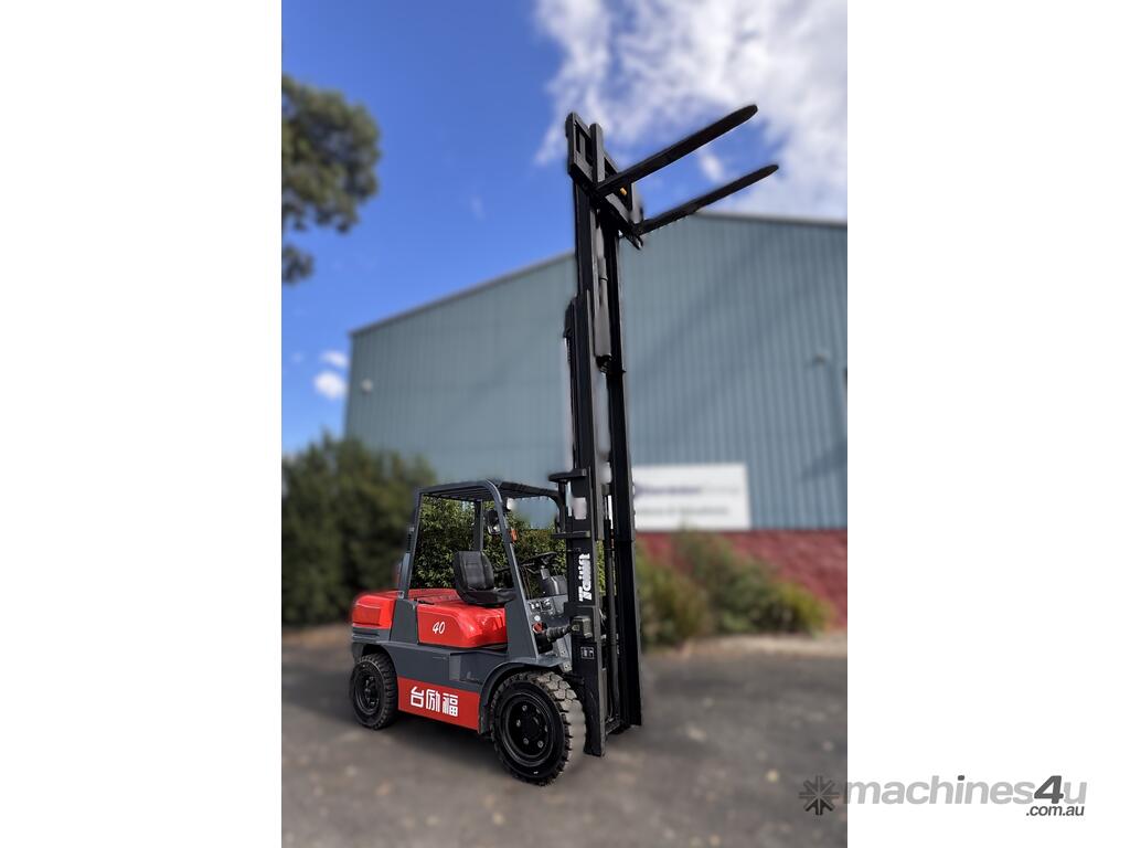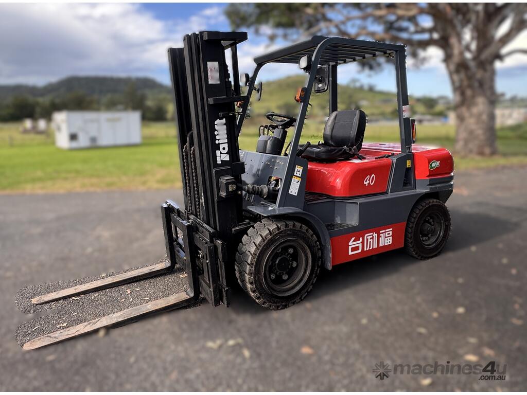 2021 TAI LIFT 4 WHEEL COUNTER BALANCE FORKLIFT. MODEL FD. DIESEL. 3 STAGE MAST. LIFT CAPACITY 4000KG HEIGHT CAPACITY 4500. SIDE SHIFT. NOTE MINOR MARKS AND SCRATCHES.
