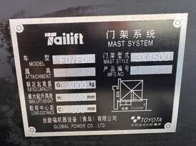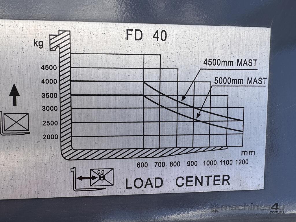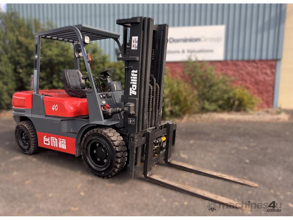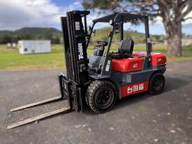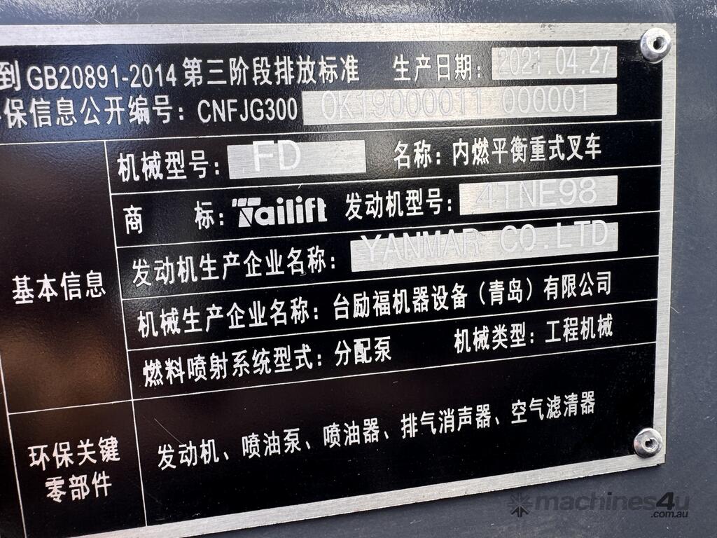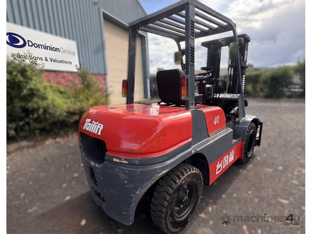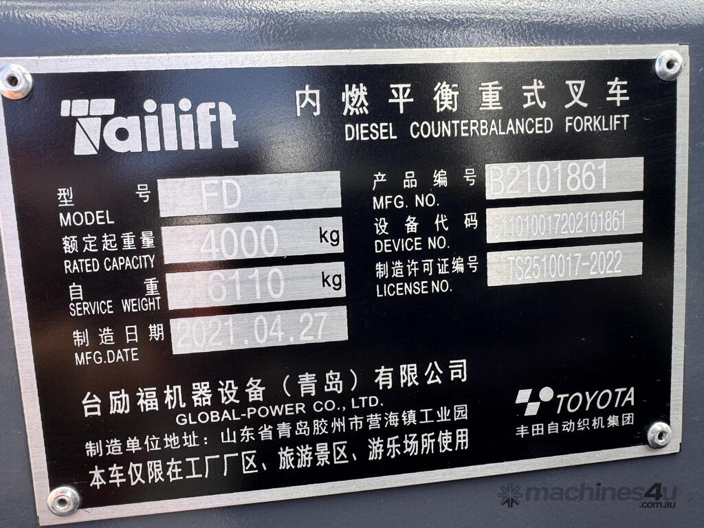 2021 TAI LIFT 4 WHEEL COUNTER BALANCE FORKLIFT. MODEL FD. DIESEL. 3 STAGE MAST. LIFT CAPACITY 4000KG HEIGHT CAPACITY 4500. SIDE SHIFT. NOTE MINOR MARKS AND SCRATCHES.