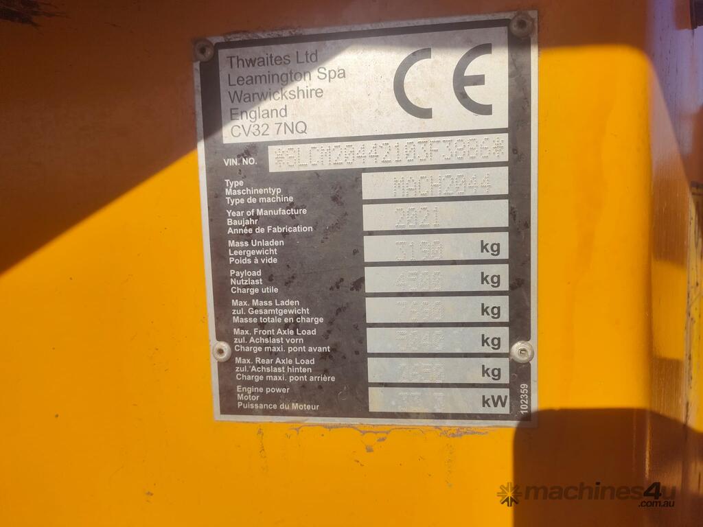 USED 2021 THWAITES 4.5T ARTICULATED SITE DUMPER WITH FULL CIVIL SPEC AND LOW 384 HOURS, FOUR WHEEL DRIVE, FLOATATION TYRES, 4 SPEED HYDROSTATIC TRANSMISSION, FOLDING ROPS WITH OPERATOR SUN SHADE, 180 DEGREE SWIVEL SKIP, TOW HITCH, ROAD LIGHTS, RISK ASSESSMENT AND 3 MONTH DRIVETRAIN WARRANTY