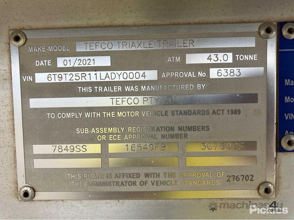 CP: 01/2021,Built: 01/2021,Tefco,Triaxle ,Tri Axle Tipping A Trailer,0 (undefined),Colour: White,Rego. No: NP(YN02MR), Unregistered NSW,VIN: 6T9T25R11LADY0004,Sold with No Plates