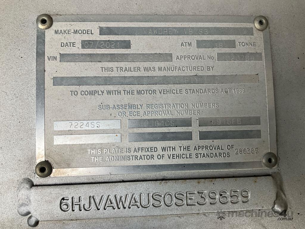 CP: 07/2021,Vawdrey,VB S3,Tri Axle Drop Deck Curtainsider A Trailer,639368 (Kms. Showing on Hubometer),Colour: Blue,Rego. No: NP(YQ10ND), Unregistered,VIN: 6HJVAWAUS0SE39859,Sold with No Plates