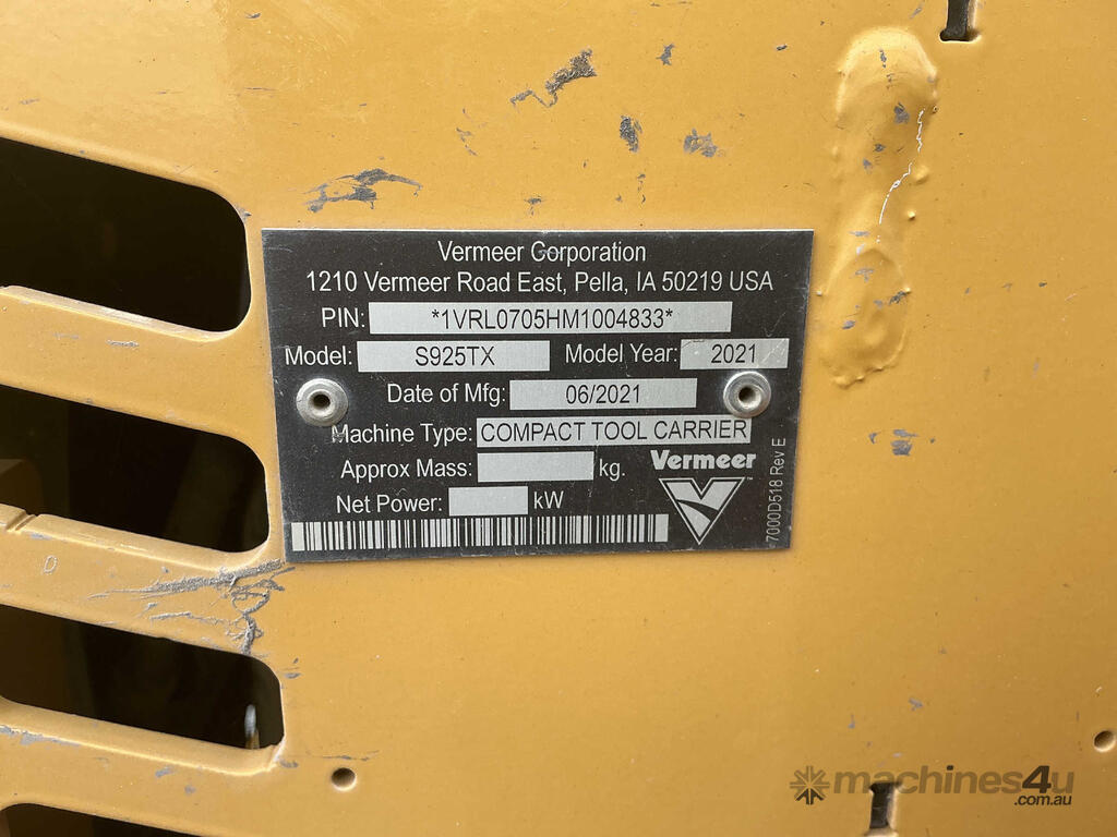 CP: 06/2021,Vermeer,S925TX,Mini Loader,Diesel,Odometer not visible,790 (Hrs. Showing on Hour meter),Colour: Yellow,Unregistered,VIN: 1VRL0705HM1004833,Sold with No Plates,WOVR Status: WOVR N/A,Incident Type: Impact