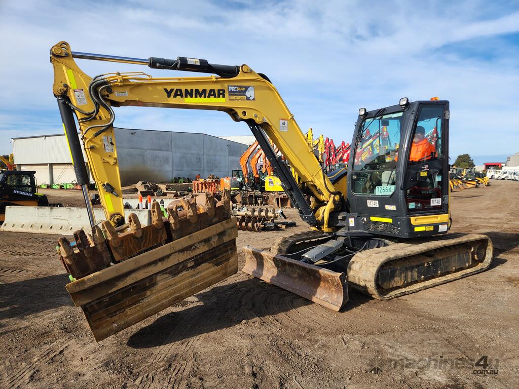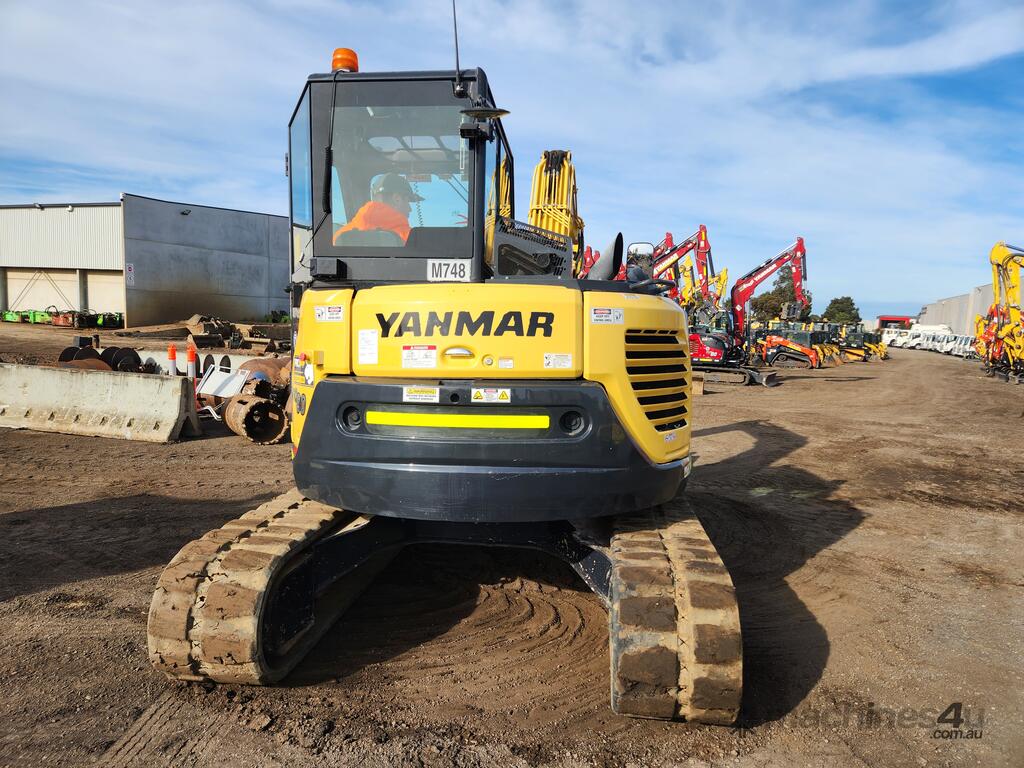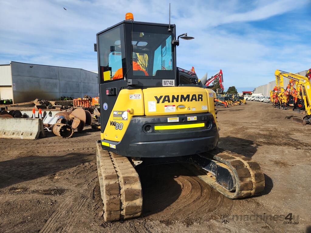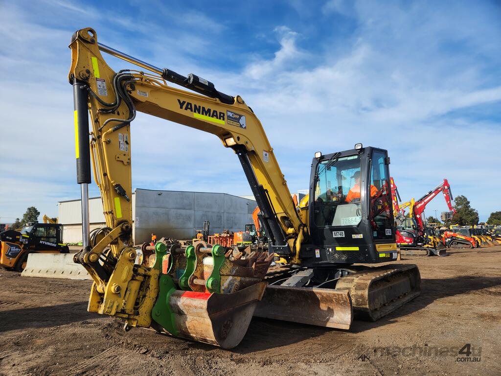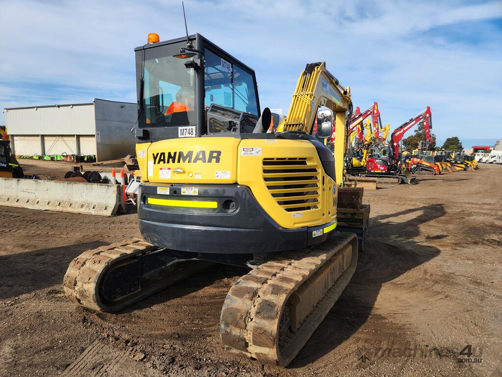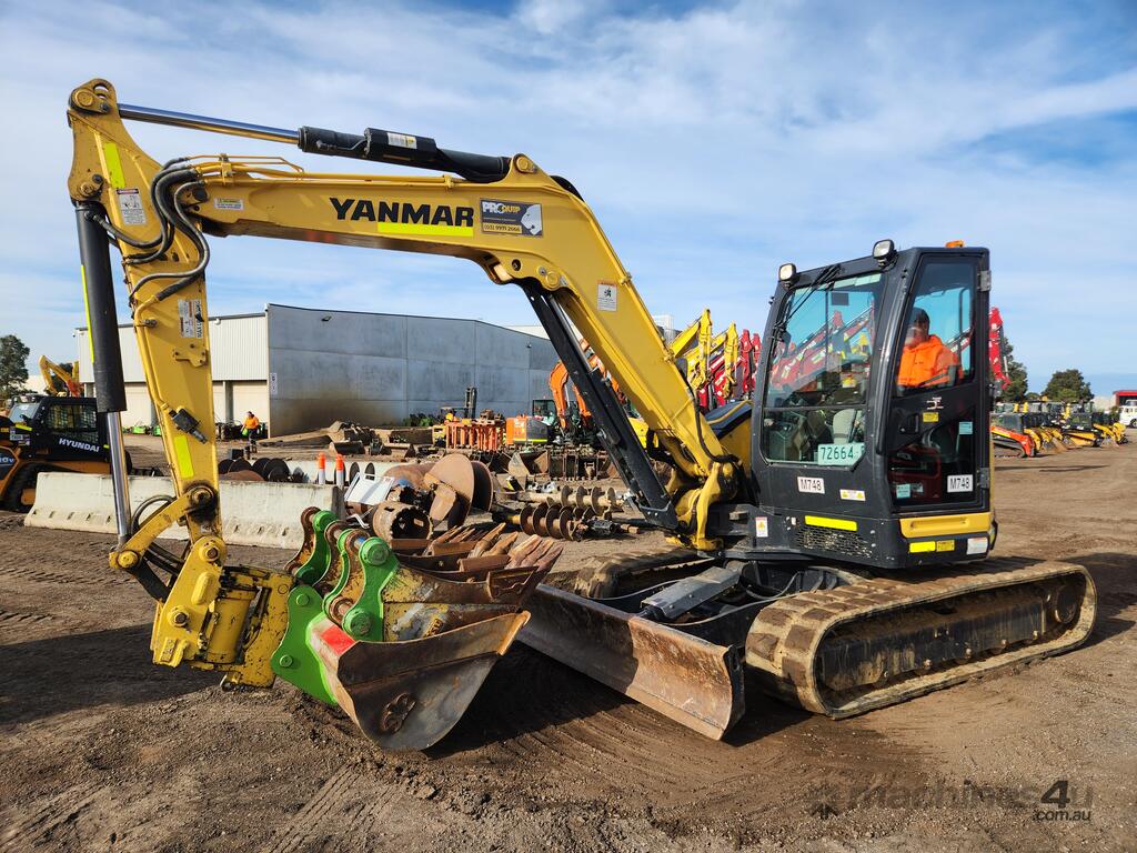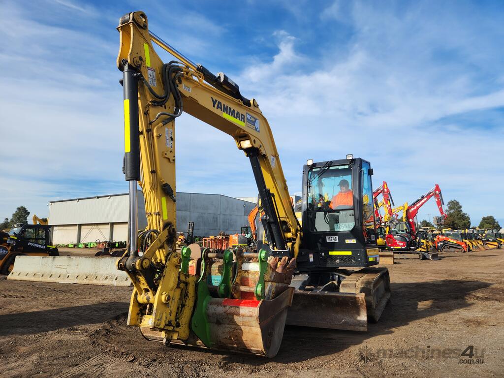 2021 YANMAR VIOT EXCAVATOR WITH TILT HITCH AND 2394 HRS (M748), ONE OWNER, AUSTRALIAN DELIVERED AUGUST 2021, 8200KG OPERATING WEIGHT, ZERO TAIL SWING, RUBBER TRACKS, SWIVEL BOOM, FULL A/C CABIN WITH ROPS, DOZER BLADE, AUXILIARY HYDRAULICS WITH PROPORTIONAL CONTROLS, AUTO IDLE FUNCTION, TRAVEL ALARMS, HYDRAULIC SAFETY TILTING QUICK HITCH, 450 & 600mm DIG BUCKETS, MUD BUCKET. RISK ASSESSMENT, UHF RADIO, E-STOPS, ISOLATOR, FULL SERVICE HISTORY, READY TO WORK. 3-MONTH DRIVETRAIN WARRANTY APPLIES.