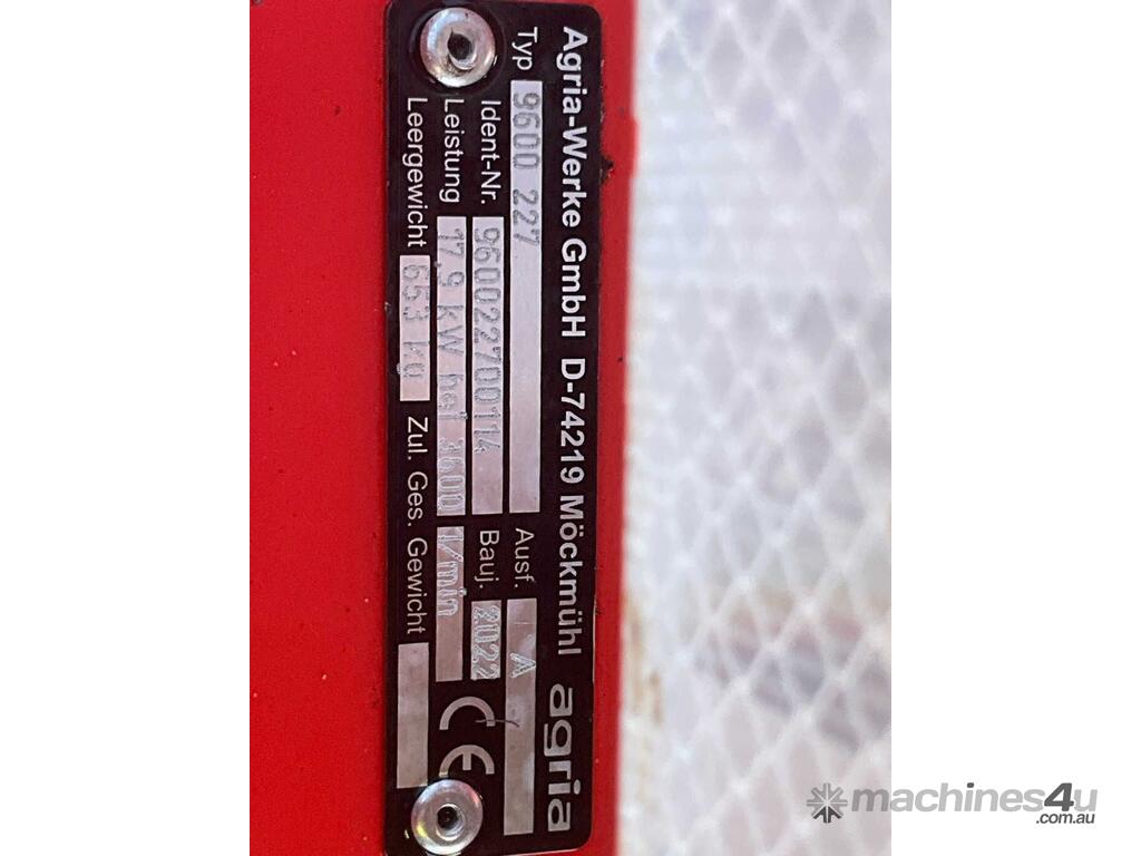 CP: CIRCA 2022,Agria,9600,Mower & Trailer Combination ,Engine #: FS730VE27297,2 Cyl,Hybrid,Odometer not visible,751 (Hrs. Showing on Hour meter),Colour: Red,Unregistered,Serial No: 14,Sold with No Plates,Key No: SWITCH