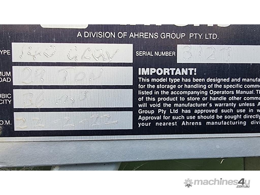 2022 Ahrens 29T Field Bin. Purchased new in 2022 and have only been used for two season (wheat only), great condition. Easily accessible base manhole, spring-assisted wheel lift and safety latch, ALUZINC steel sidewalls and roof construction, 2 x 1,060mm wide full length ground rectangular filling doors, 2 x sight glasses fitten on both sides in all units, removable discharge hopper and manual side gate. Serial No. 3127. Contact Grady Sinclair on for more information. Located near Narrabri, NSW.