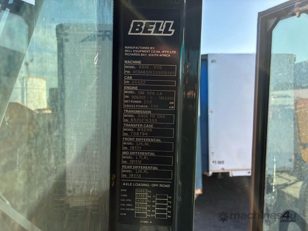 CP: CIRCA 2022,Bell,B30E,Articulated Dump Truck,6 Cyl,Diesel,Odometer not visible,6125 (Hrs. Showing on Hour meter),Colour: Yellow,Unregistered,VIN: AEBA830EE03009389,Sold with No Plates