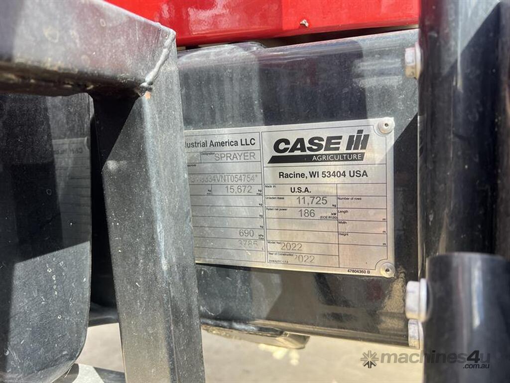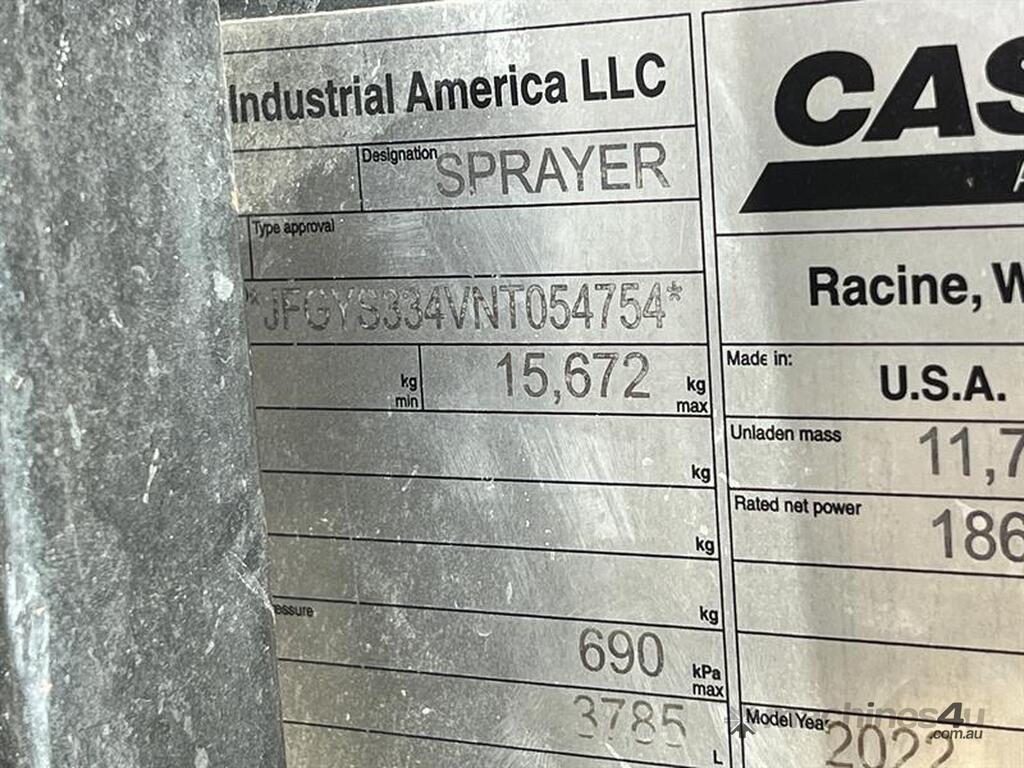 2022 CASE IH 3330 Sprayer. 1,806hrs showing - currently working. Delivered November 2022, Always serviced by Kenway and Clark Inverell - they recently replaced the centre section of boom due to manufacturer fault, 3800L Stainless tank, stainless inductor, auto greaser. VIN: JFGYS334VNT054754. Located near Graman, NSW. Available at MRE Online Auctions.