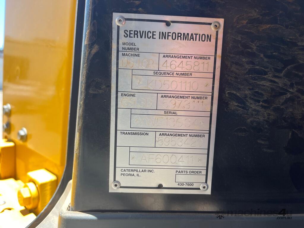 CP: CIRCA 2022,Caterpillar,D6 LGP,Dozer (Steel Track),Engine #: 5973111,9.3 Ltr,6 Cyl,Diesel,Odometer not visible,2654 (Hrs. Showing on Hour meter),Colour: Yellow,Unregistered,Serial No: CAT000D6PKD501110,Sold with No Plates