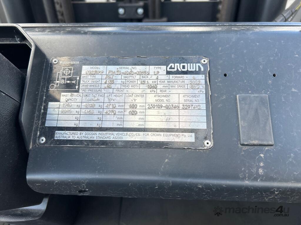 CP: CIRCA 2022,Crown,CG25NXP,Forklift,LPG only,Odometer not visible,106 (Hrs. Showing on Hour meter),Colour: Grey,Unregistered,Serial No: FGA6,Sold with No Plates,Key No: 40