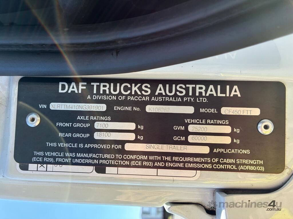 CP: 08/2022,Built: 08/2022,DAF,CF450 FTT,Prime Mover Sleeper Cab,Automatic,Airbag,Engine #: K106262,6 Cyl,Diesel,174290 (Kms. Showing on Odometer),Hourmeter not visible,Colour: White,Unregistered,VIN: XLRTTM410NG391901,Key No: 122,GVM: 25200,GCM: 60000,Sold with No Plates,Key No: 122