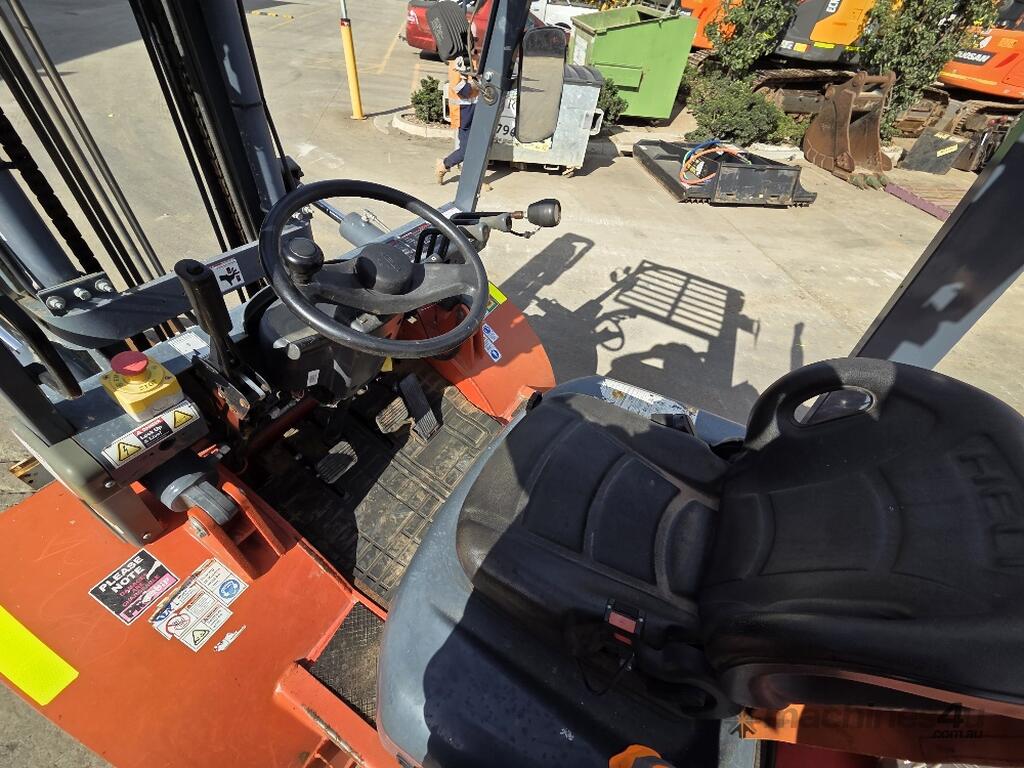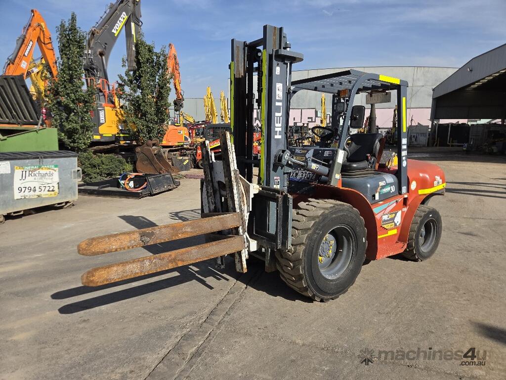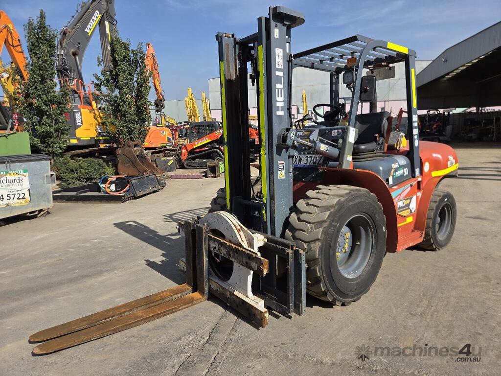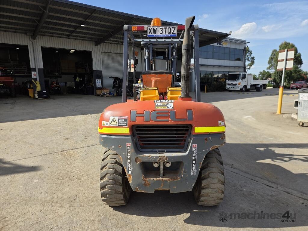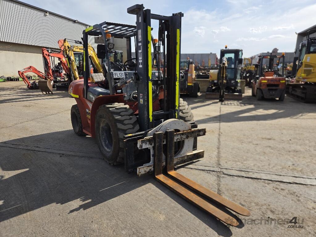 2022 HELI GREEN SERIES ALL-TERRAIN DIESEL FORKLIFT (FL131) WITH 3.0T RATED CAPACITY, ROTATING FORKS, SIDE SHIFT, TILT, ROPS CANOPY, WORK LIGHTING, CIVIL SPEC, RISK ASSESMENT AND LOW 1230 HOURS.