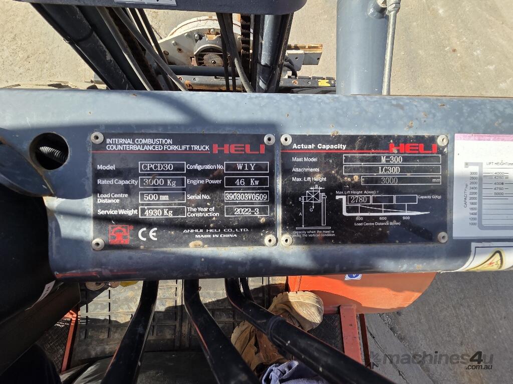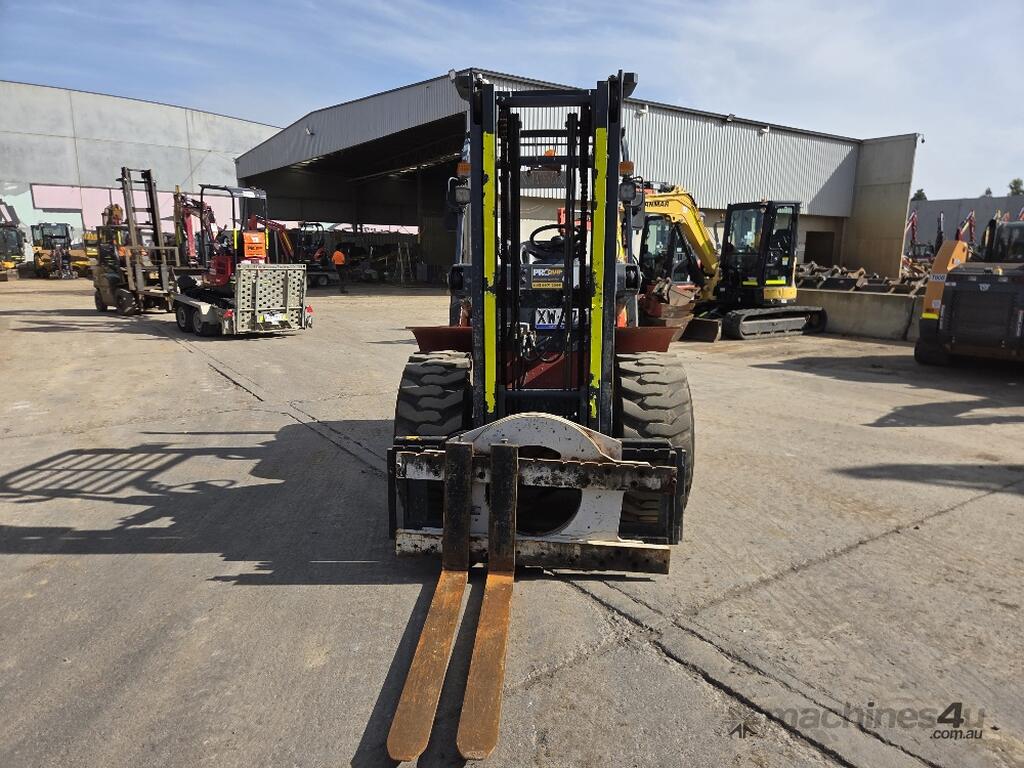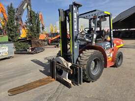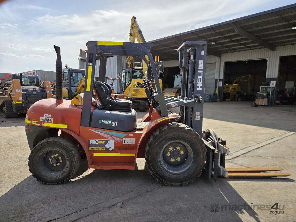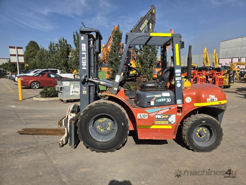 2022 HELI GREEN SERIES ALL-TERRAIN DIESEL FORKLIFT (FL131) WITH 3.0T RATED CAPACITY, ROTATING FORKS, SIDE SHIFT, TILT, ROPS CANOPY, WORK LIGHTING, CIVIL SPEC, RISK ASSESMENT AND LOW 1230 HOURS.