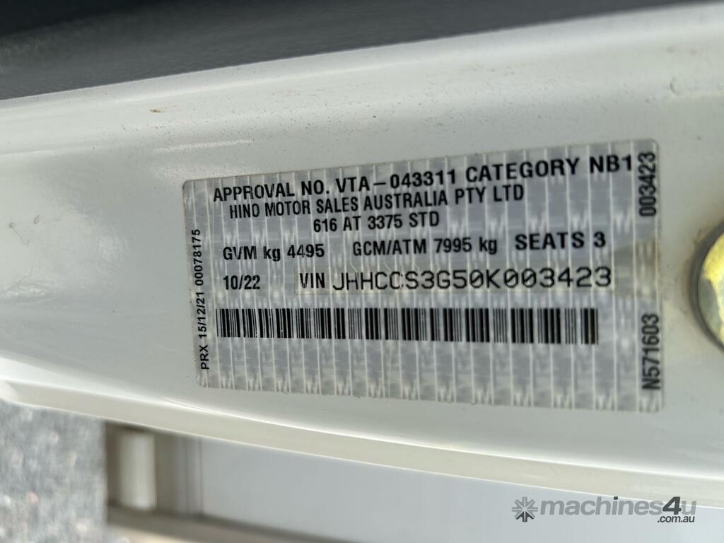 CP: 10/2022,Hino,300 616 ,Refrigerated Pantech,Automatic,Spring,4 Cyl,Diesel,240913 (Kms. Showing on Odometer),Hourmeter not visible,Colour: White,Rego. No: 446KZ7 QLD,VIN: JHHCCS3G50K003423,Key No: 24,GVM: 4495,GCM: 7995,Sold with No Plates,Key No: 24