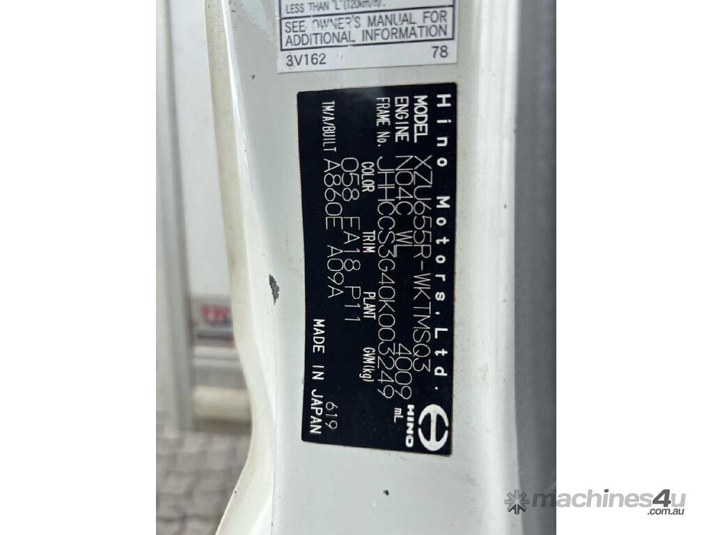 CP: 03/2022,Hino,300 616 ,Refrigerated Pantech,Automatic,Leaf Spring Suspension,Engine #: N04CWL15018,Hino N40C,4 Cyl,Diesel Turbo,264754 (Kms. Showing on Odometer),7018 (Hrs. Showing on Hour meter),Colour: White,Rego. No: NP(K11KD), Unregistered TAS,VIN: JHHCCS3G40K003249,Length: 5.8 M,GVM: 4495,GCM: 7995,Sold with No Plates
