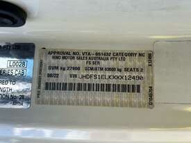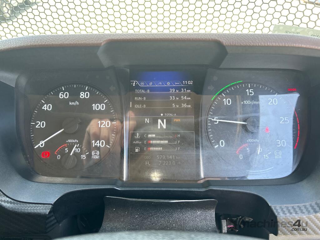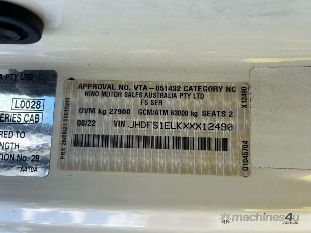 CP: 08/2022,Built: 08/2022,Hino,FS 700 2848,Curtainsider,Automatic,Airbag,Engine #: E13CBK10296,12910 Ltr,6 Cyl,Diesel,579140 (Kms. Showing on Odometer),7222 (Hrs. Showing on Hour meter),Colour: White,Rego. No: NP(XB19DA), Unregistered QLD,VIN: JHDFS1ELKXXX12490,Key No: 73,Length: 7636 m,GVM: 27900,GCM: 63000,Sold with No Plates,Key No: 73