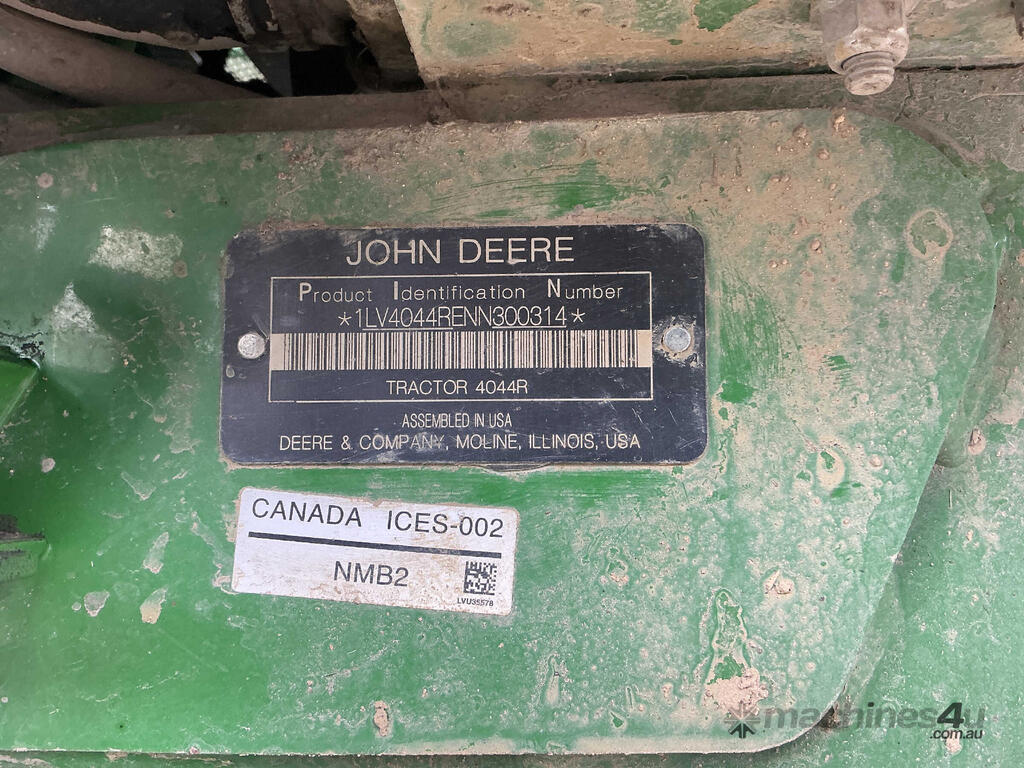 CP: CIRCA 2022,John Deere,4044R,Tractor 4 x 4,Diesel,Odometer not visible,Hourmeter not visible,Colour: Green,Unregistered,VIN: 1LV4044RENN300314,Serial No: NULL,Sold with No Plates,WOVR Status: WOVR N/A,Incident Type: Impact