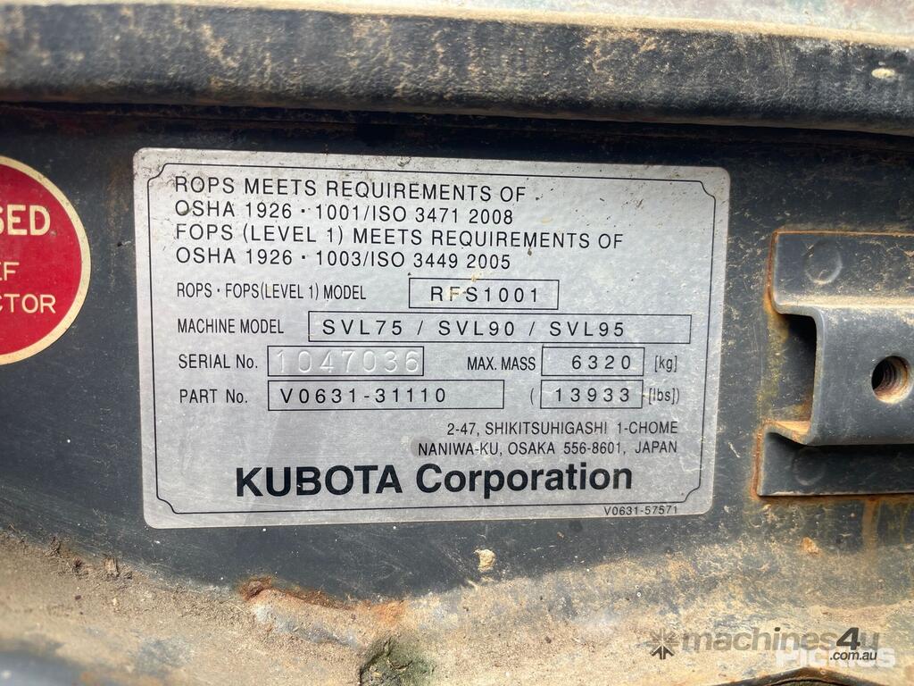 CP: CIRCA 2022,Built: 03/2020,Kubota,SVL75-2,Skid Steer (Rubber Tracked),Engine #: 8LE2216,3331 CC,4 Cyl,Diesel,Odometer not visible,1596 (Hrs. Showing on Hour meter),Colour: Orange,Unregistered,VIN: KBCZ052CVL1D50044,ROPS No: 1847036,Sold with No Plates,Key No: M3