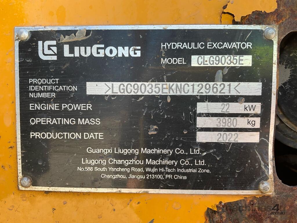 CP: CIRCA 2022,Liugong,CLG9035E,Excavator (Rubber Tracked),4 Cyl,Diesel,Odometer not visible,2909 (Hrs. Showing on Hour meter),Colour: Yellow,Rego. No: NP(33155E), Unregistered NSW,VIN: LGC9035EKNC129621,Serial No: LGC9035EKNC129621,Sold with No Plates