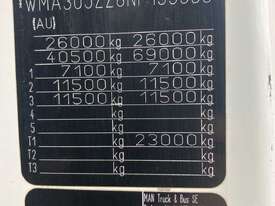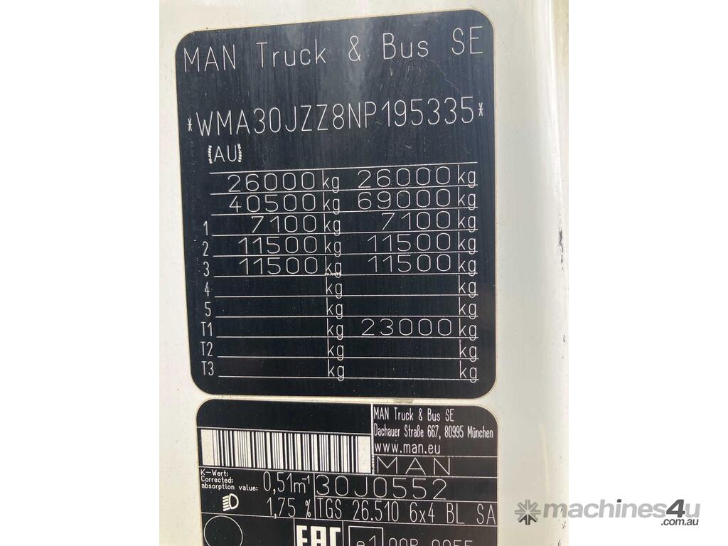 CP: 11/2022,Built: 02/2022,MAN,TGS 26.510,Prime Mover,Automatic,Airbag Rear Suspension ,6 Cyl,Diesel Turbo,151898 (Kms. Showing on Odometer),5819 (Hrs. Showing on Hour meter),Colour: White,Rego. No: NP(XW71EK), Unregistered NAT,VIN: WMA30JZZ8NP195335,Length: 7 m,GVM: 23000,GCM: 11500,Sold with No Plates