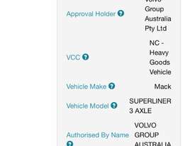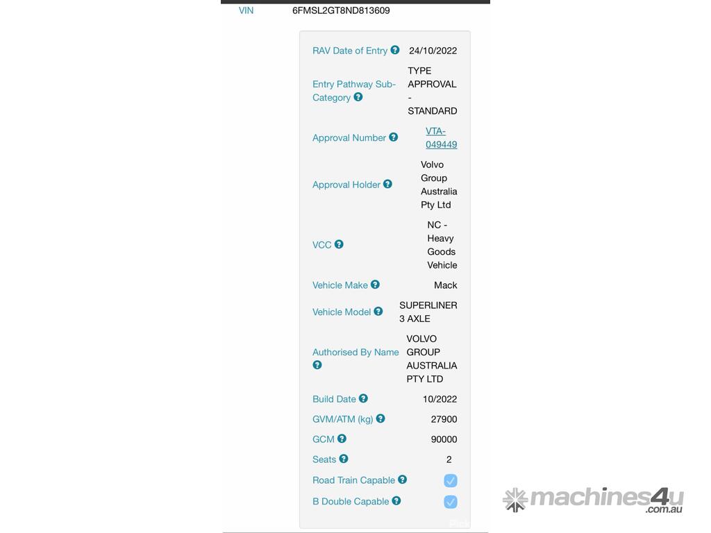 CP: 10/2022,Built: 10/2022,Mack,Superliner CLXT,Prime Mover Sleeper Cab,Automatic,Airbag,MP10,6 Cyl,Diesel Turbo,Odometer not visible,Hourmeter not visible,Colour: White,Rego. No: NP(1HYA505), Unregistered WA,VIN: 6FMSL2GT8ND813609,Length: 8.1 m,GVM: 27900,GCM: 90000,Sold with No Plates,WOVR Status: WOVR N/A,Incident Type: Impact