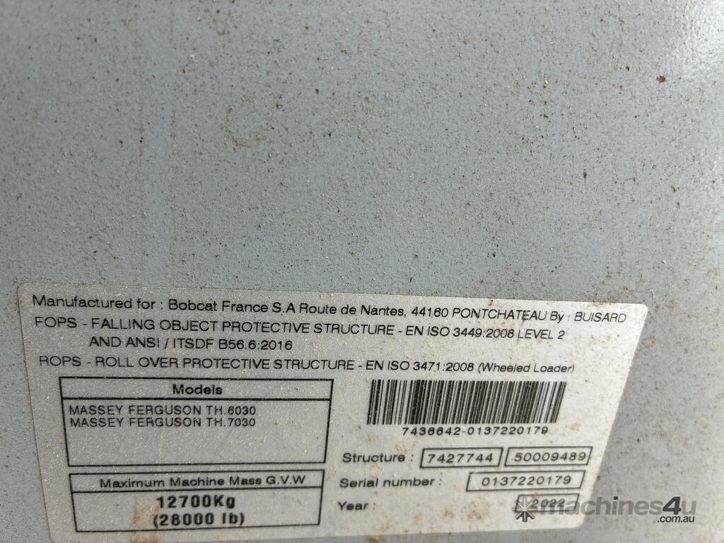 2022 Massey Ferguson TH-6030 Telehandler. Machine only has 820 hours. Tyres are near new. Comes with automatic greasing system, airconditioned ROPS/FOPS cabin. Immaculate condition throughout. Priced at $89,000.00 + GST = $97,900.00 including GST. Machine is located in Brisbane. NOTE THERE ARE NO ATTACHMENTS WITH MACHINE.