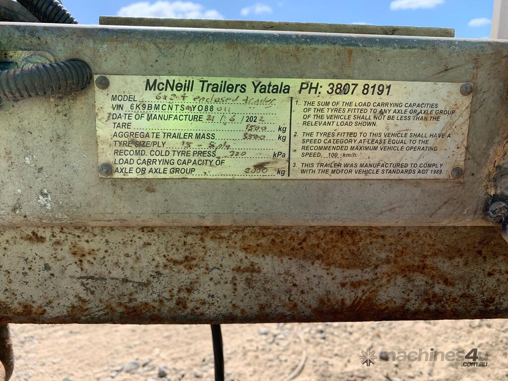 CP: 06/2022,McNeill Trailers,Tandem Axle Enclosed Trailer,0 (undefined),Colour: White,Rego. No: NP(774UOW), Unregistered QLD,VIN: 6K9BMCNTSMY088011,Serial No: NULL,Sold with No Plates,WOVR Status: WOVR N/A,Incident Type: Impact