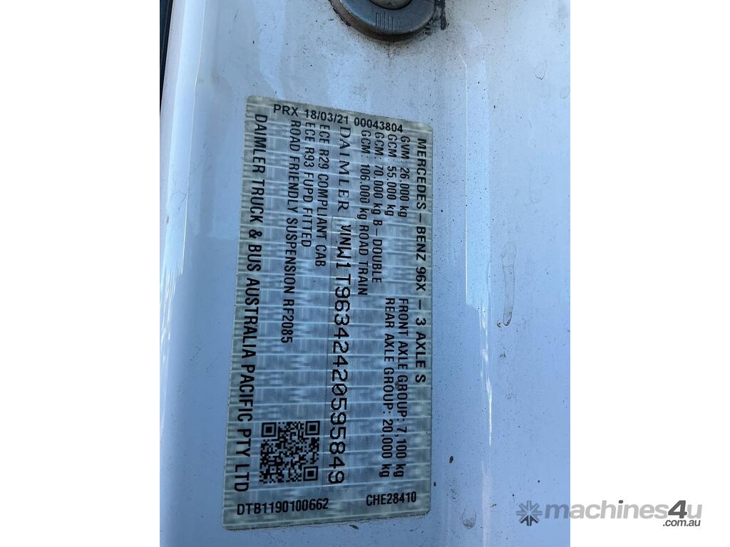 CP: 04/2022,Mercedes Benz,Actros 2663,6x4 Prime Mover,Automatic,Air Bag Suspension ,6 Cyl,Diesel Turbo,431934 (Kms. Showing on Odometer),Hourmeter not visible,Colour: White,Rego. No: NP(1HTF896), Unregistered WA,VIN: W1T5849,Key No: 205,GVM: 26000,GCM: 106000,Sold with No Plates,WOVR Status: WOVR N/A,Incident Type: Impact,Key No: 205