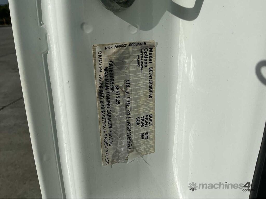 CP: 01/2022,Built: 10/2021,Mitsubishi Fuso,Rosa,Bus,Automatic,Spring,4 Cyl,Diesel,43211 (Kms. Showing on Odometer),Hourmeter not visible,Colour: White,Unregistered,VIN: JLFBE741J0RM10291,Key No: 6,Length: 7.85 M,GVM: 6285,Sold with No Plates,Key No: 6