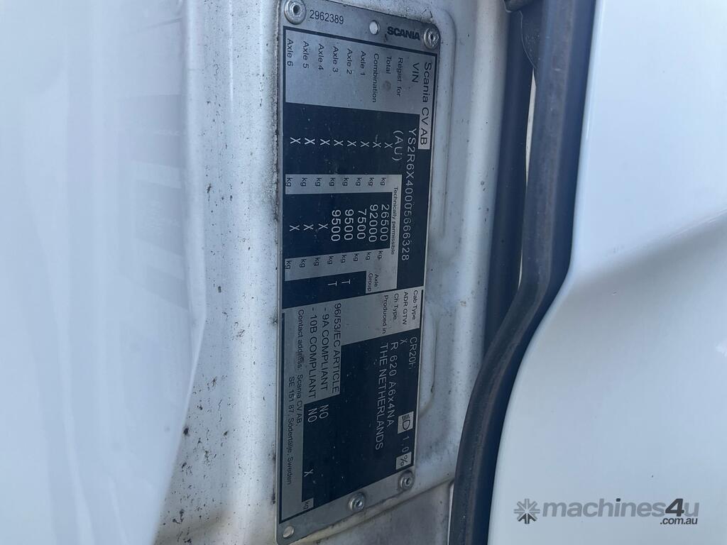 CP: 11/2022,Built: 11/2022,Scania,R620,Prime Mover Sleeper Cab,Automatic,Airbags ,Engine #: 1189305,8 Cyl,Diesel Turbo,617283 (Kms. Showing on Odometer),7733 (Hrs. Showing on Hour meter),Colour: White,Rego. No: NP(XO57LF), Unregistered NSW,VIN: YS2R6X8,Key No: 97E,Length: 7 m,GVM: 25900,GCM: 92000,Sold with No Plates,Key No: 97E
