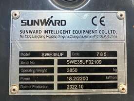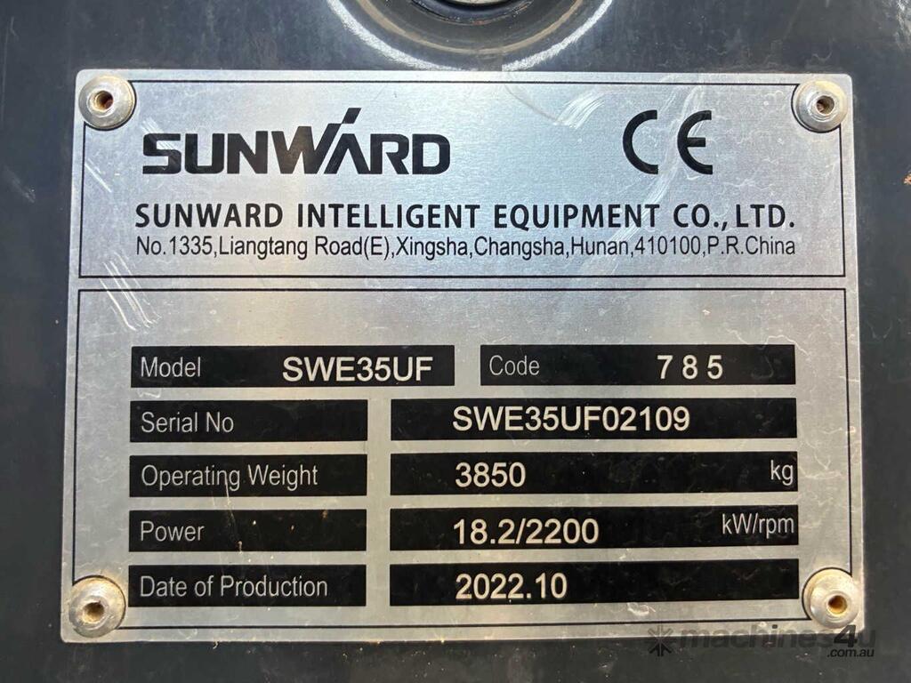 CP: CIRCA 2022,Sunward,SWE35UF,Excavator (Rubber Tracked),3 Cyl,Diesel,Odometer not visible,106 (Hrs. Showing on Hour meter),Colour: Blue,Unregistered,Serial No: SWE35UF02109,Sold with No Plates,Key No: 388