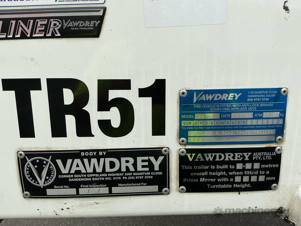 CP: 01/2022,Vawdrey,VB S3,Tri Axle Double Drop Curtainside A Trailer,739991 (Kms. Showing on Hubometer),Colour: White,Rego. No: NP(YQ80PI), Unregistered,VIN: 6HJVAWAUS0SE40251,Sold with No Plates