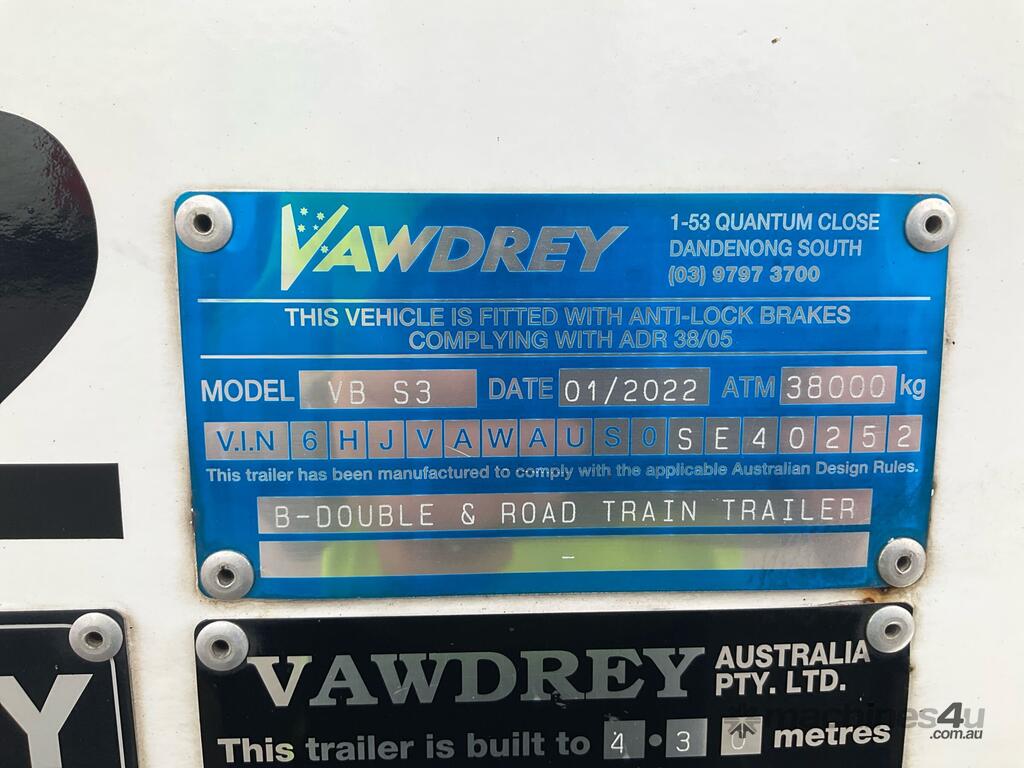 CP: 01/2022,Vawdrey,VB S3,Tri Axle Double Drop Curtainside B Trailer,817860 (Kms. Showing on Hubometer),Colour: White,Rego. No: NP(YQ31PI), Unregistered,VIN: 6HJVAWAUS0SE40252,Sold with No Plates