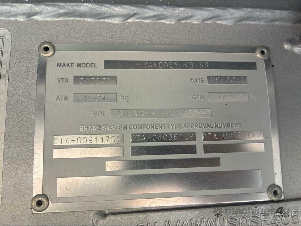 CP: 09/2022,Built: 09/2022,Vawdrey,VB S3,Tri Axle Drop Deck Curtainsider A Trailer,2853 (Kms. Showing on Hubometer),Colour: Silver,Unregistered,VIN: 6HJVAWAUS0SE40510,Sold with No Plates